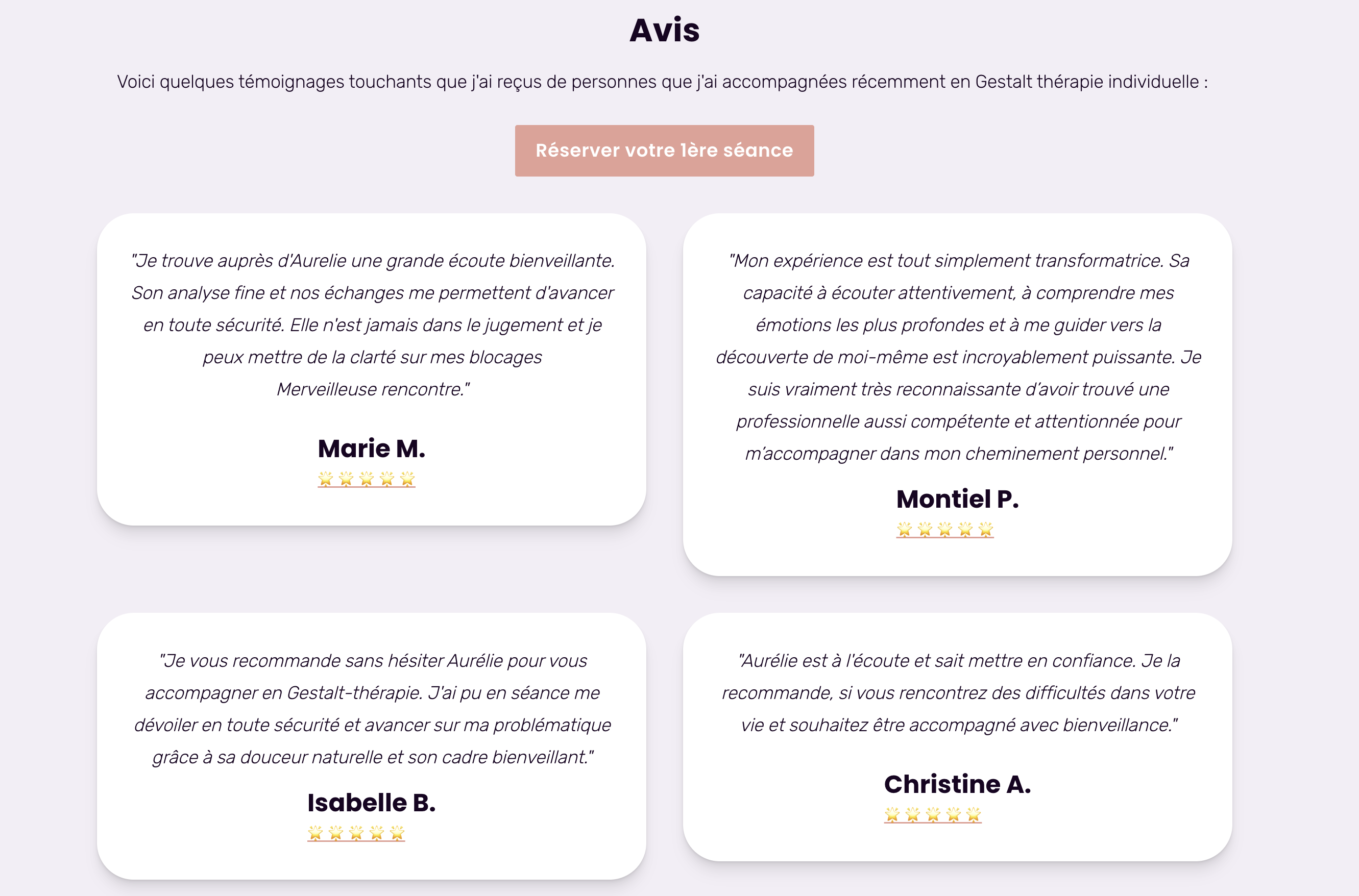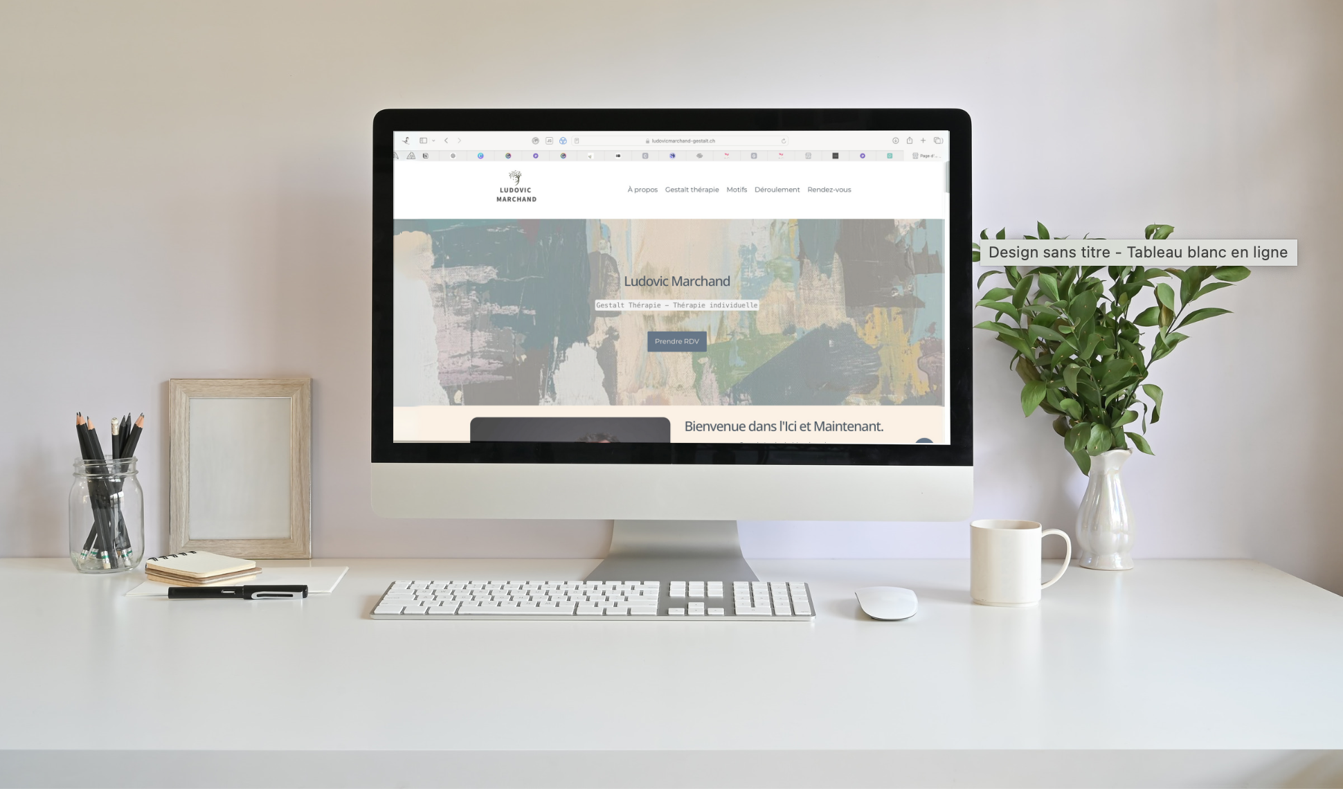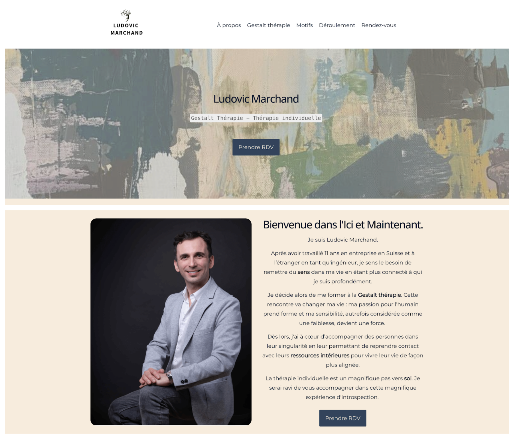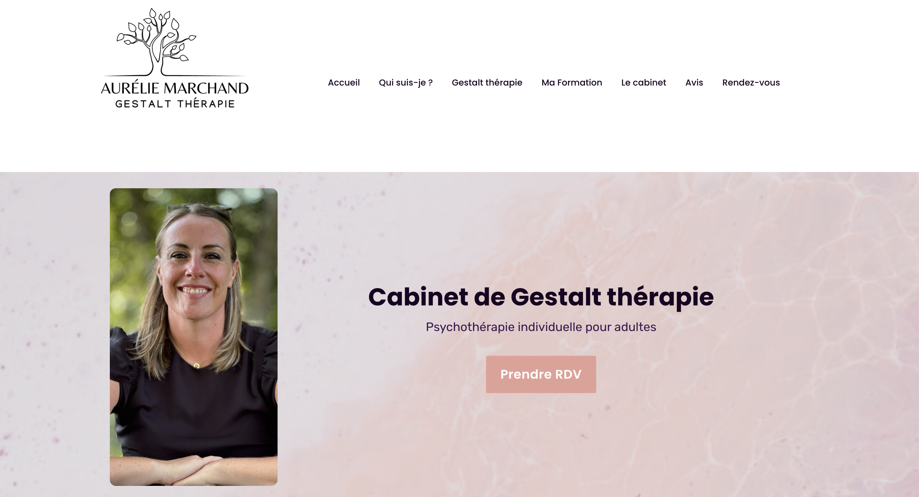 La page d'accueil est la première impression que vous faites aux visiteurs. Comme celle de ma femme, qui est Gestalt thérapeute à Genève, elle doit être claire, accueillante et donner un aperçu de vos services.